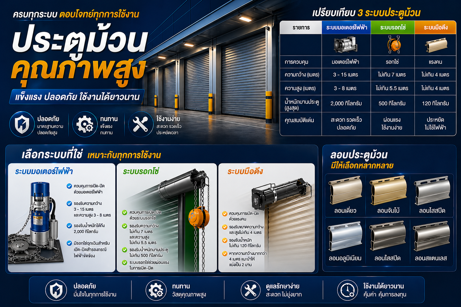 ในการเลือกติดตั้งประตูม้วน สิ่งสำคัญที่สุดคือการเลือก "ระบบการทำงาน" ให้เหมาะสมกับขนาดพื้นที่ น้ำหนัก และความสะดวกในการใช้งาน เพื่อให้การลงทุนครั้งนี้คุ้มค่าและปลอดภัยที่สุด วันนี้ วิริยะโลหะกิจ จะพาทุกท่านไปทำความเข้าใจความแตกต่างของทั้ง 3 ระบบครับ